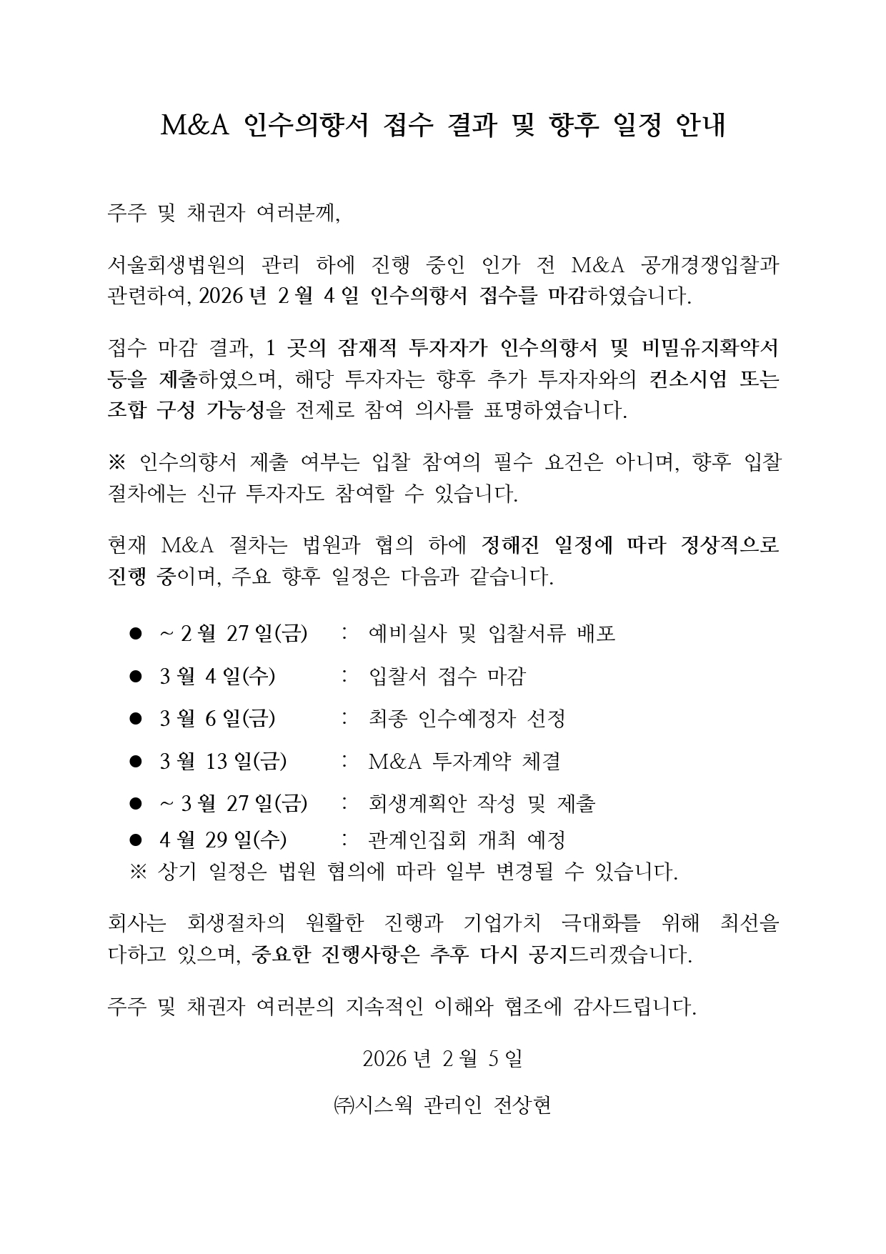 M&A 인수의향서 접수 결과 및 향후 일정 안내